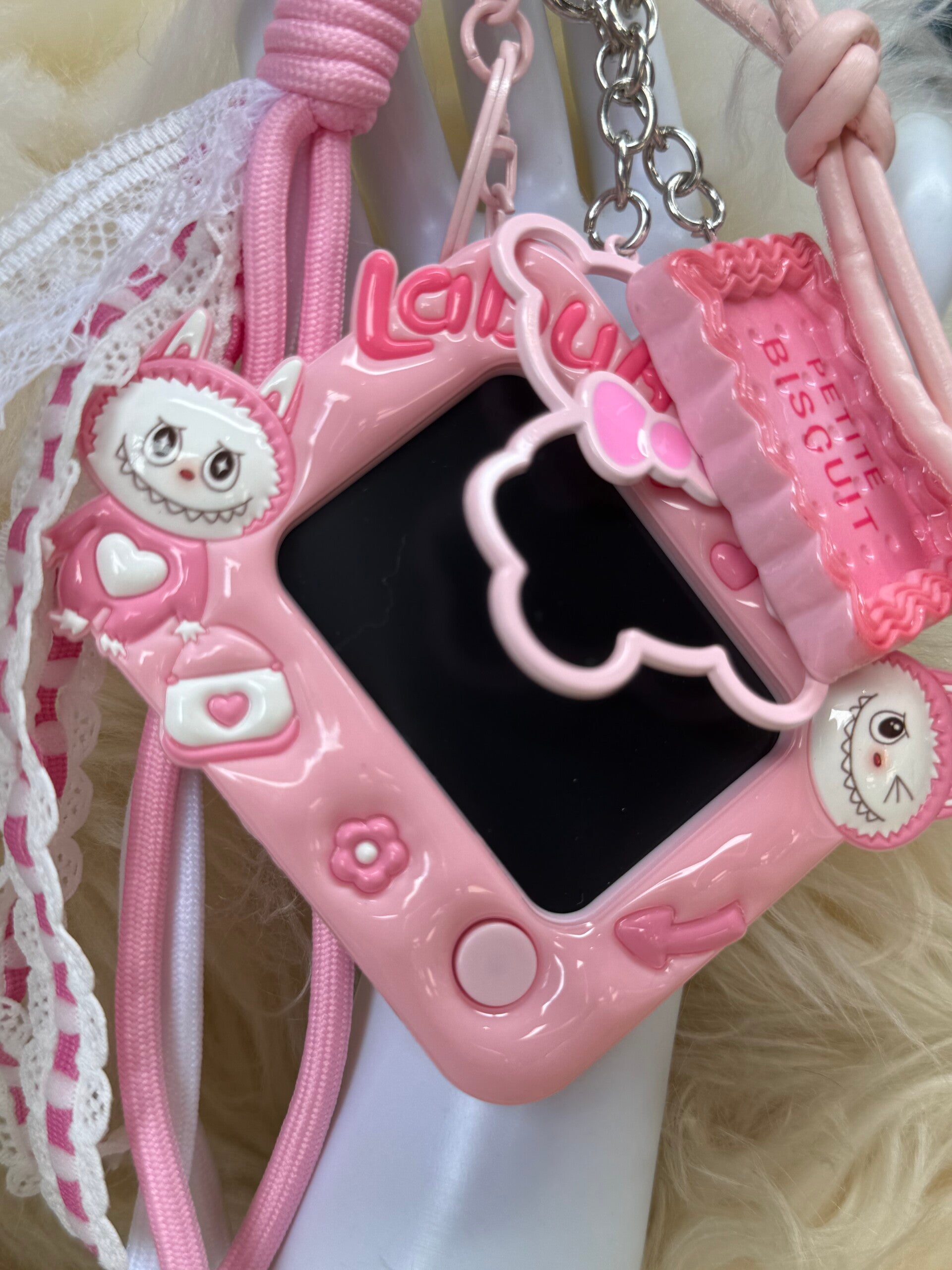 Een roze Labubu sleutel/tashanger met een Labubu mini tekentablet dat echt werkt.