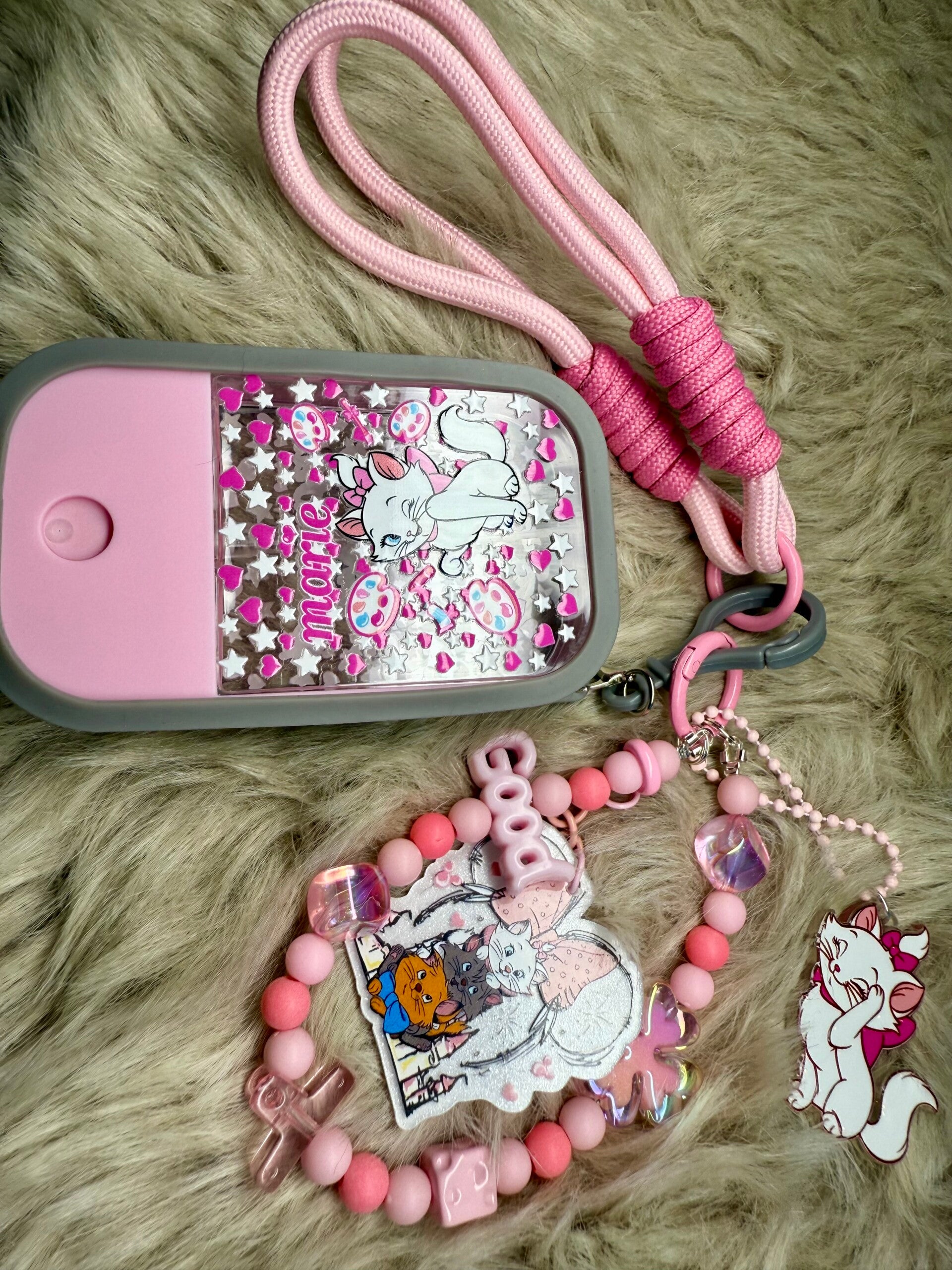 Een sleutel/tashanger met een Marie Cat spraybottle voor water of desinfectiemiddel.